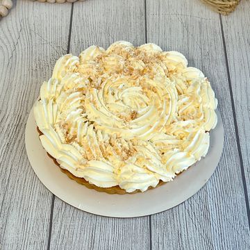 Sweet coconut cream is flavoured with almond and vanilla, then topped with chantilly cream and toasted coconut.