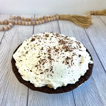 Classic French silk cream fills our Oreo crust then it's topped with fresh Chantilly cream and chocolate shards